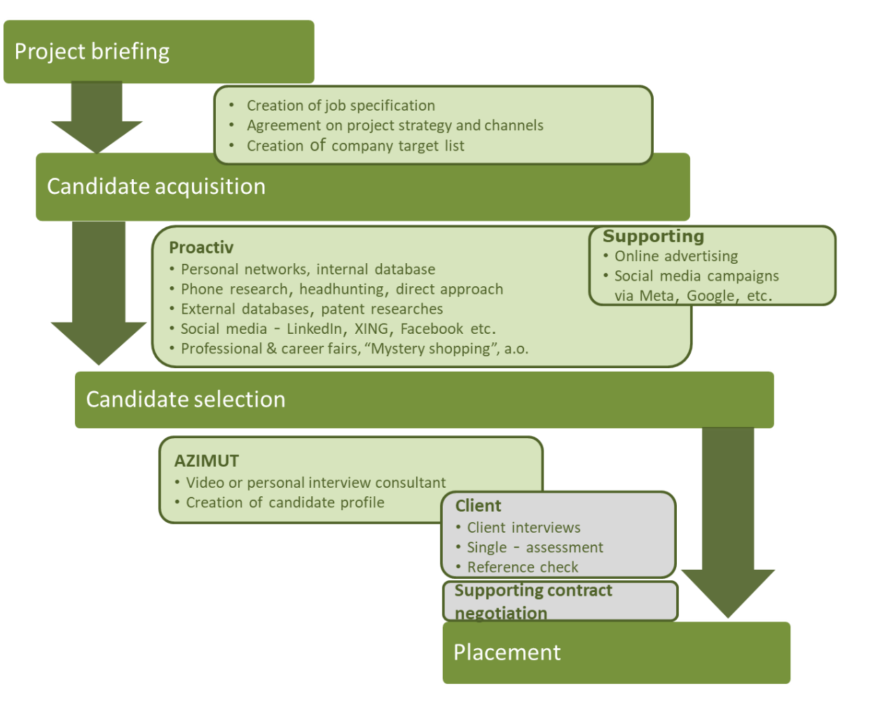 At Azimut Search & Selection 360° Recruitment is not just a “one face to the customer“ concept. We ensure the Managing Consultant is directly involved in every single stage of the assignment. Thus we ensure speed and accuracy are key to successfully acquiring and introducing the best candidates.