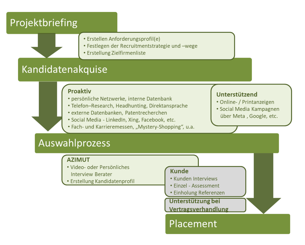 Die gesamte Abwicklung eines Suchprojektes vom Projektbriefing über Research, Ansprache, Präsentation der Kandidaten bis zur Einstellung liegt in einer professionellen Hand: der des Beraters.